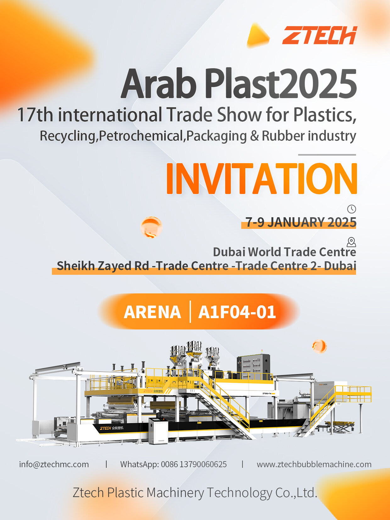 Como empresa de alta tecnología especializada en equipos de envoltura de burbujas de alta gama, nos complace anunciar que ZTECH participará en Arab Plast 2025. Este evento, que se celebrará en Dubái del 7 al 9 de enero en el stand ARENA A1F04 - 01 del Dubai World Trade Centre, constituye una plataforma importante.