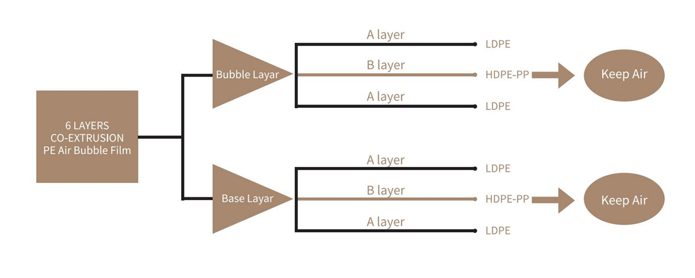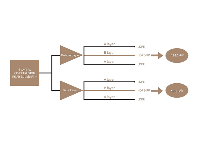 - Estructura única de coextrusión 3 en 1: La capa de burbujas y la capa base se fusionan a partir de tres capas (PE + PP/HDPE + PE), mejorando la dureza y el tacto del producto; ideal para bolsas exprés de película de burbujas y película de aluminio.