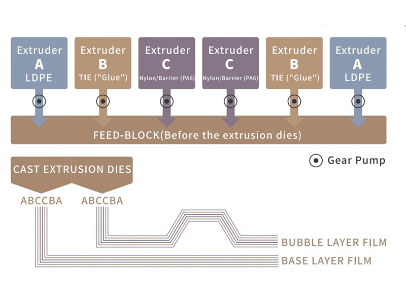 - Fuerte unión de materiales: Las capas TIE de alto rendimiento mejoran la adhesión entre el nailon y el PE, evitando la delaminación y mejorando la resistencia y durabilidad generales de la película de burbujas.